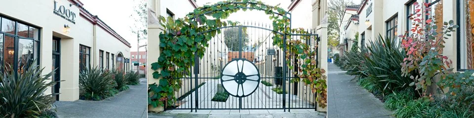 The historically appropriate colors, roof tile, and window package harmoniously pairs with the newer modern design of the courtyard, signage, and exterior hardware.