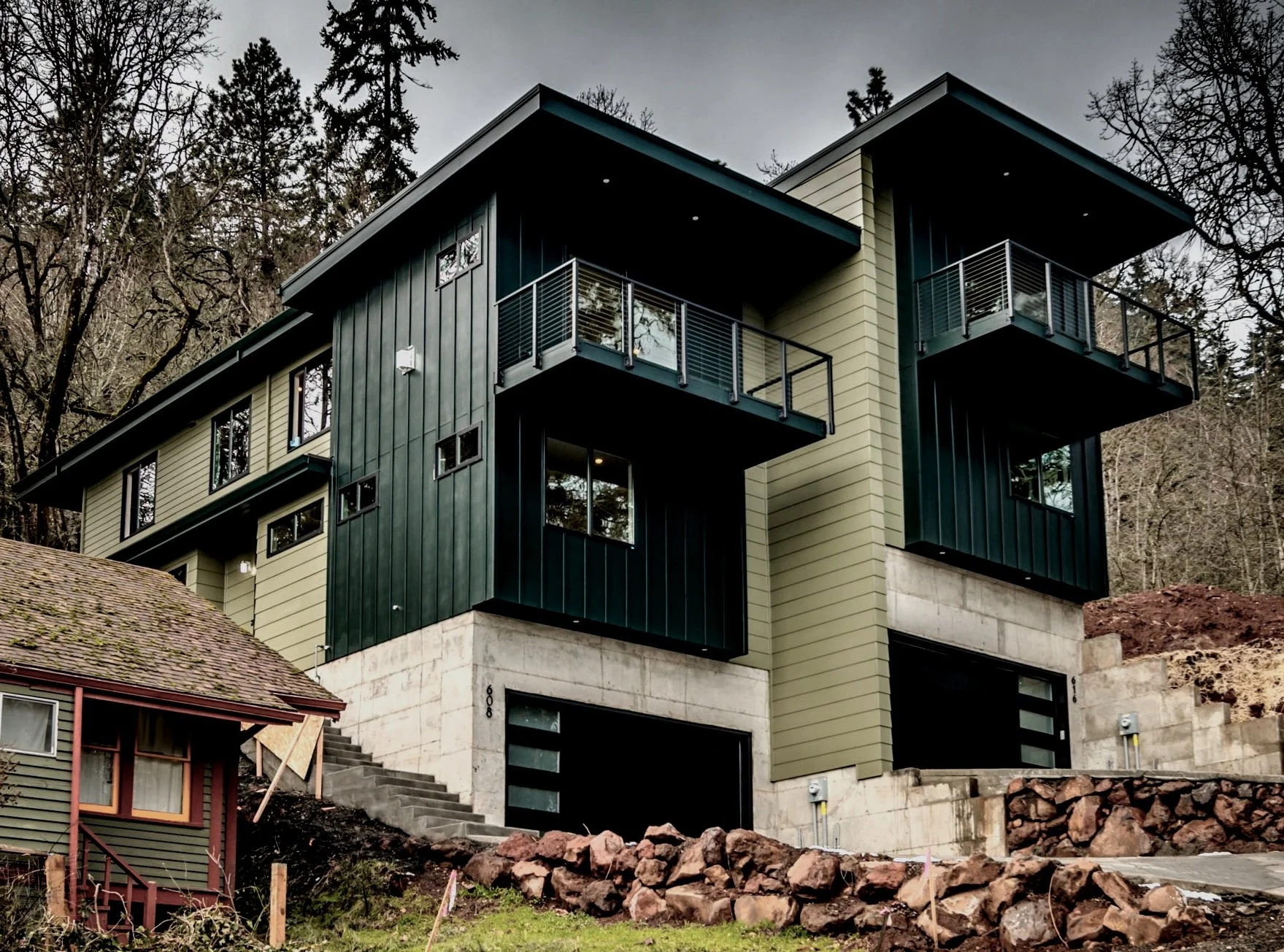 Perched on a hillside surrounded by wild forest and expansive views, this pair of townhomes serves as the prototype for a planned four-home development.