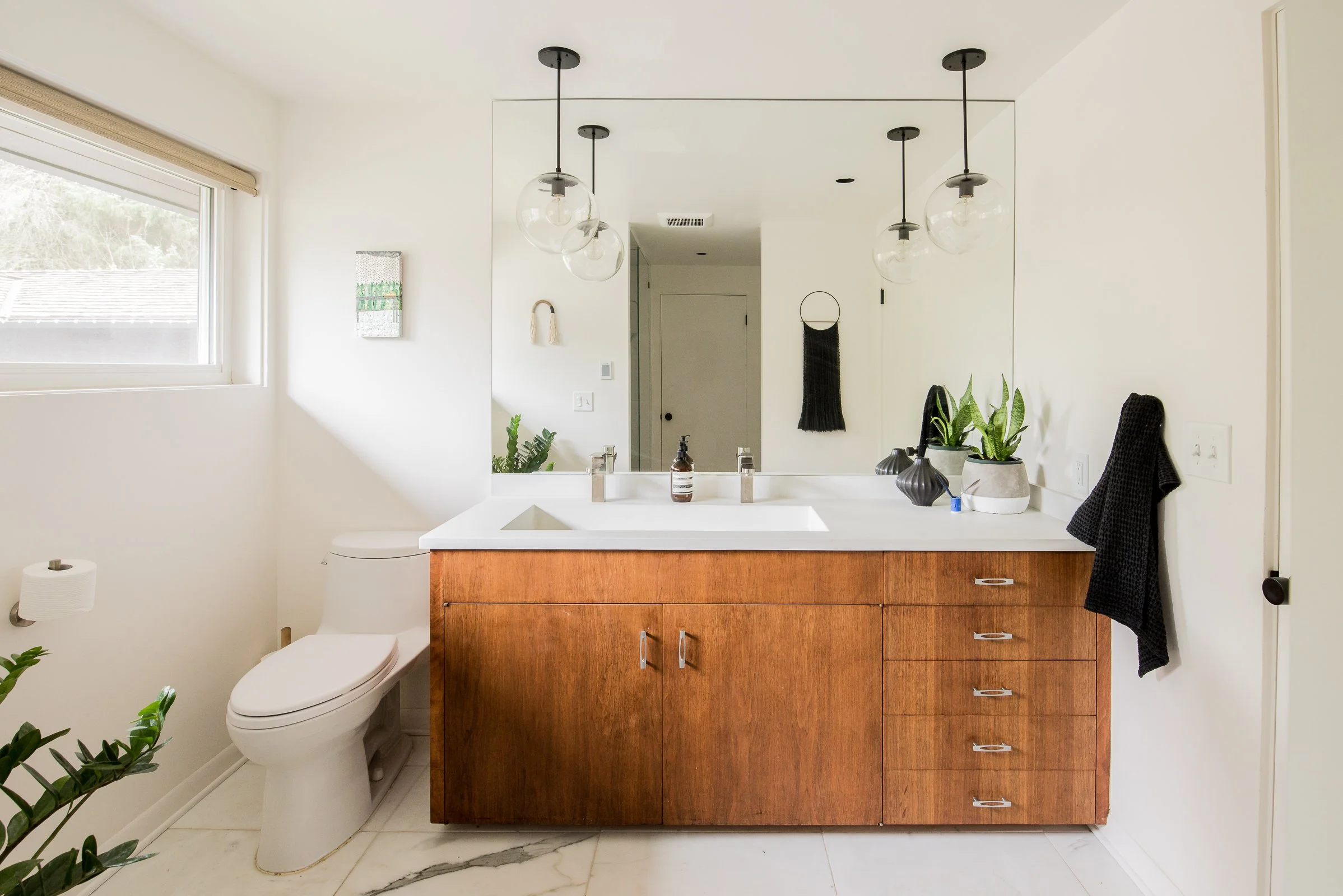 In the primary bath, restored cabinetry, Calcutta marble, and matching white concrete countertops create a timeless, elevated atmosphere.